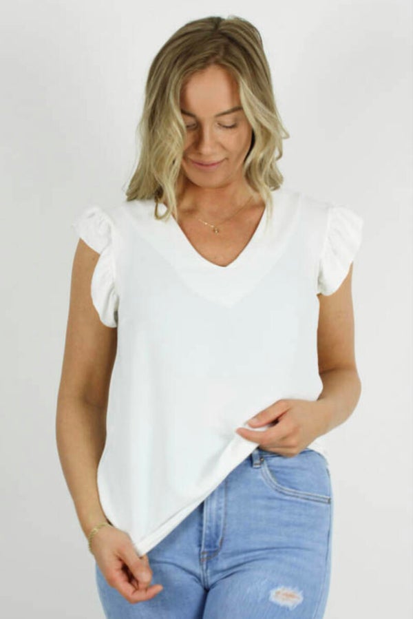 Mouwloze basic top met V- hals en ruche langs de schouder. Deze los vallende top is gemaakt in een soepele polyester kwaliteit. Deze top is one size en goed t/m maat 40.