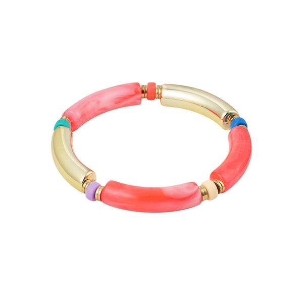 Deze leuke kleurrijke armbandjes zijn perfect te combineren met meerdere gouden armbandjes, superleuk! Het armbandje heeft een elastieken bandje en is gemaakt van acryl en hematiet en heeft een afmeting van 19,5 cm.