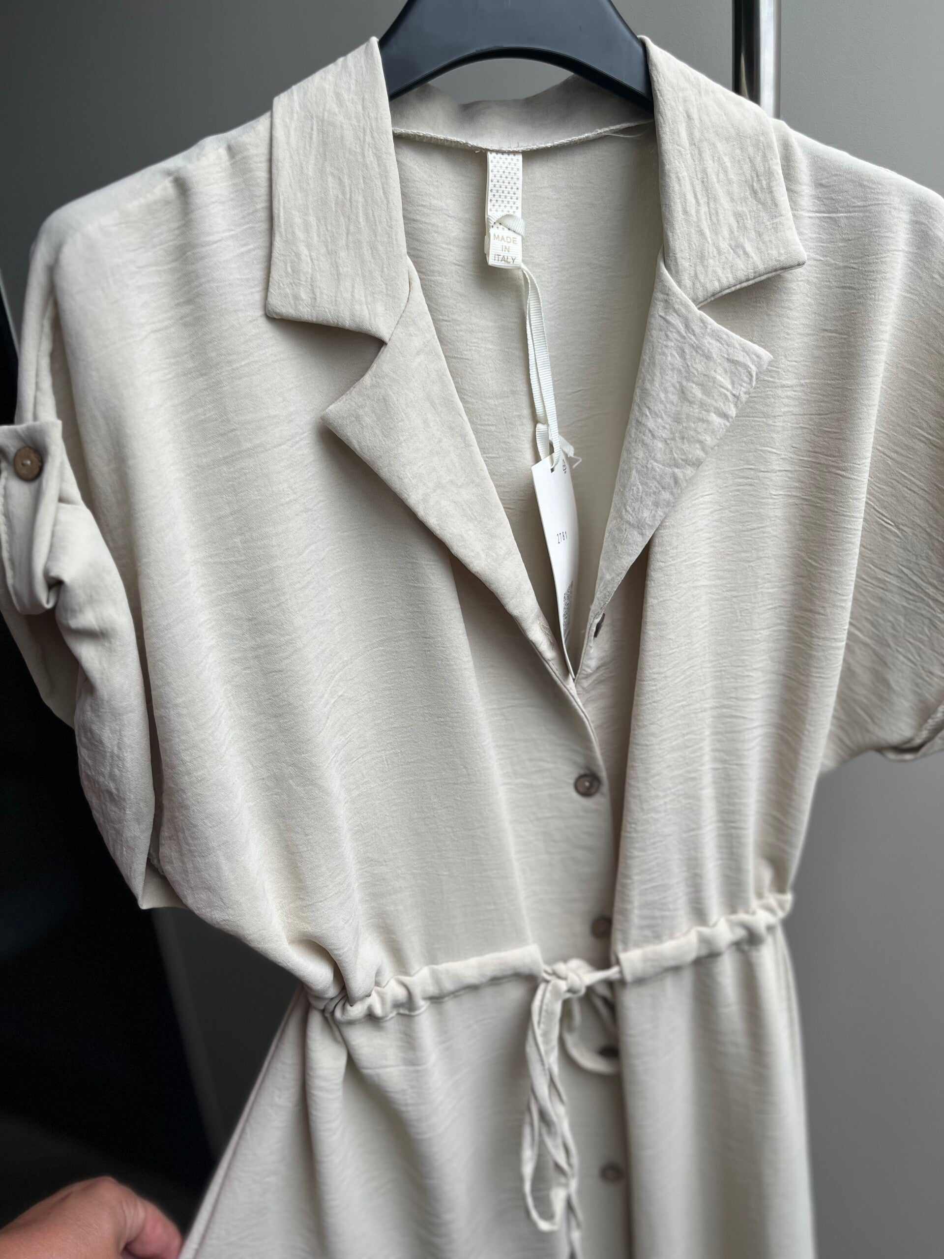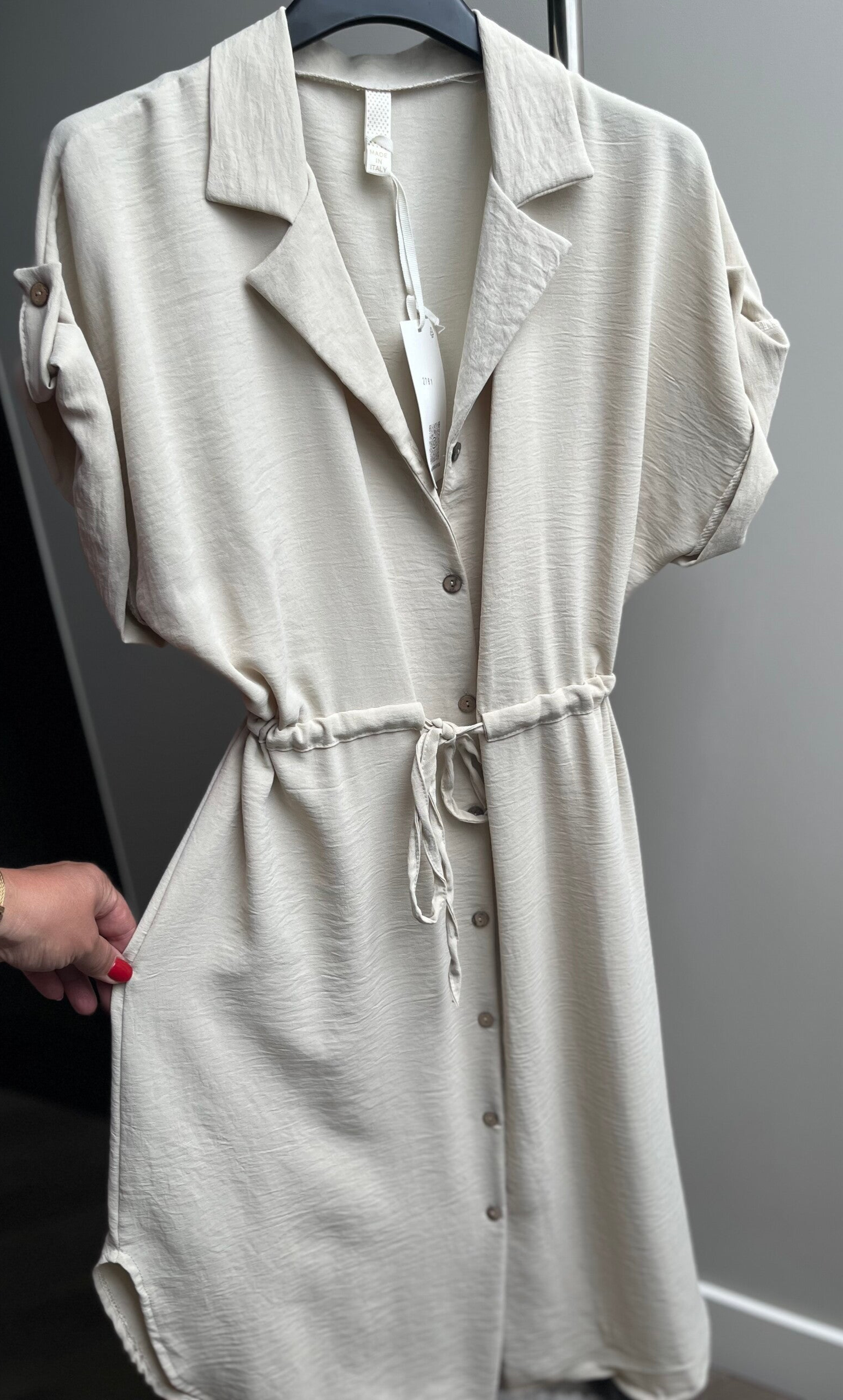 Doorknoopjurk met in de taille een bandje zodat je bij de taille iets kunt aansnoeren.