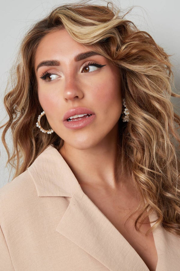 Van deze vrolijke gouden oorbellen met witte bloemetjes word je toch meteen vrolijk! Deze oorbellen zijn superleuk te dragen tijdens een zomerse gelegenheid! De oorbellen zijn gemaakt van metaal en kristalkralen en hebben een lengte van 5 cm!