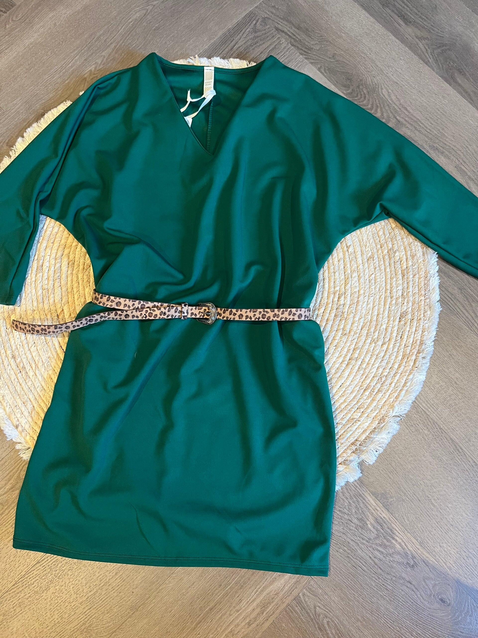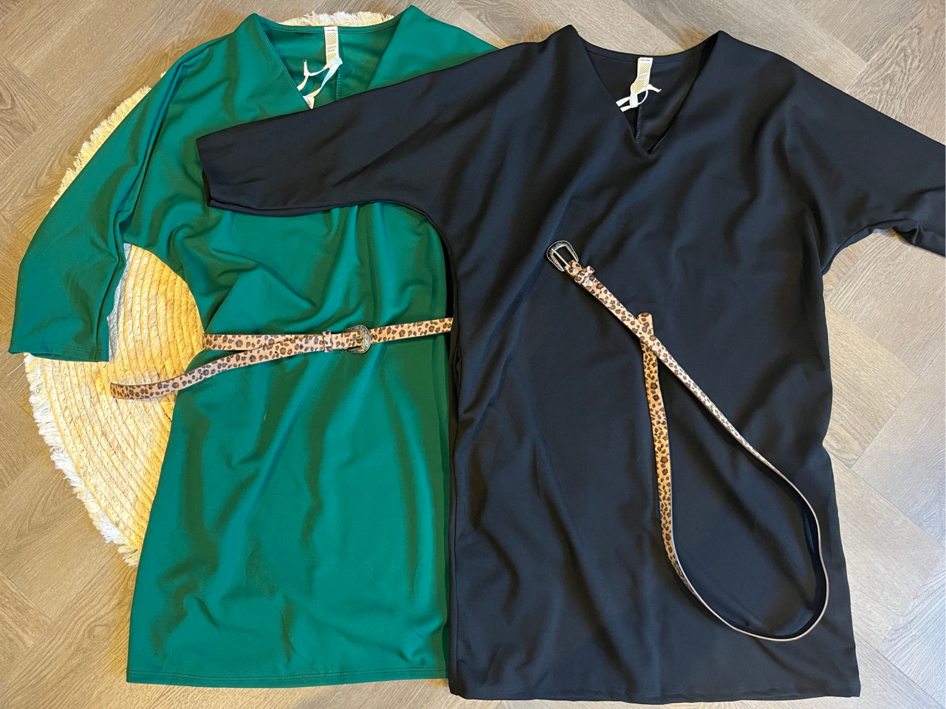 Tuniek/jurkje Ellen is er in groen en zwart heeft een driekwart vleermuis mouwtje en een v-hals