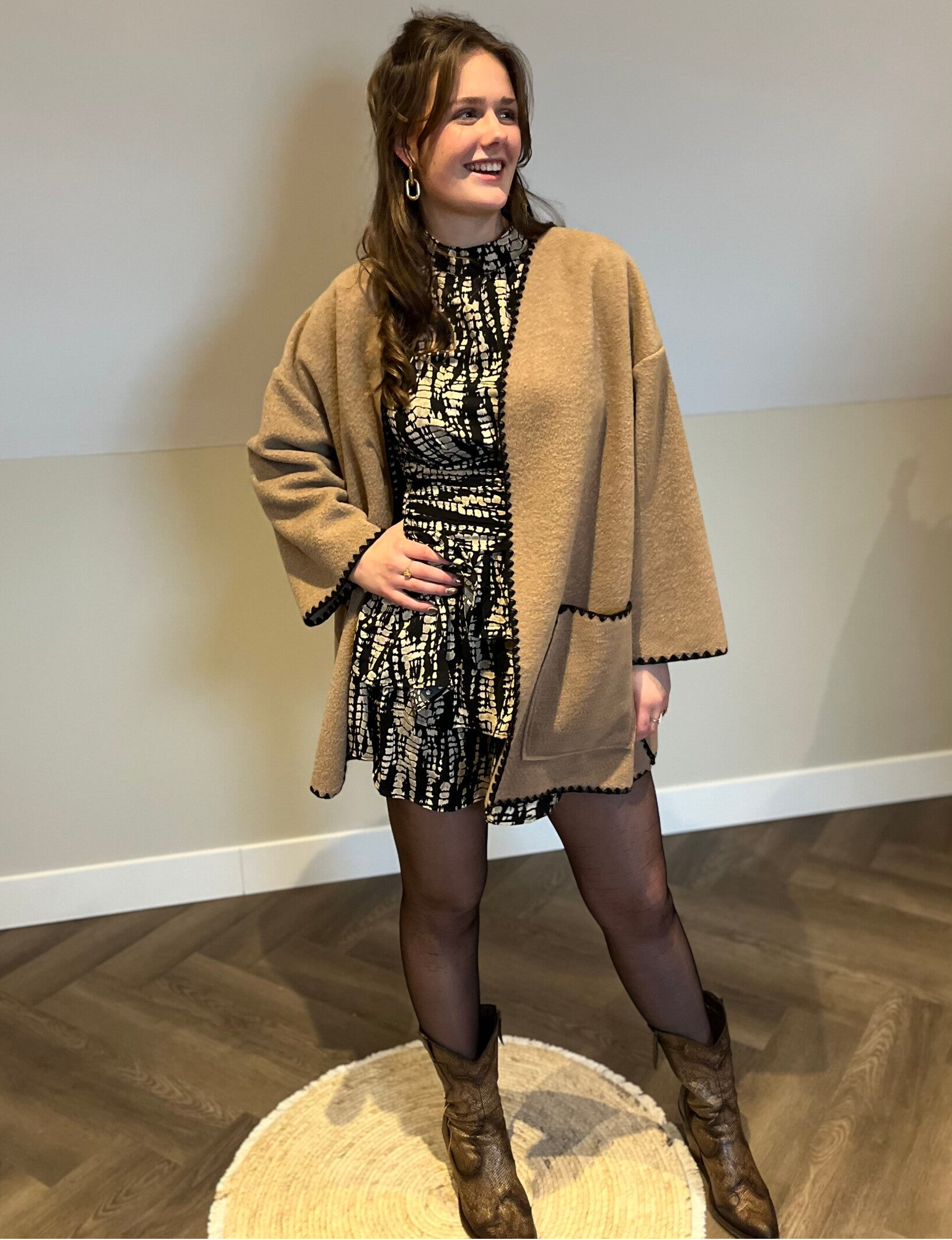 Hier gecombineerd met jurk Kiki maar je kunt hem ook leuk op een jeans of pantalon dragen.