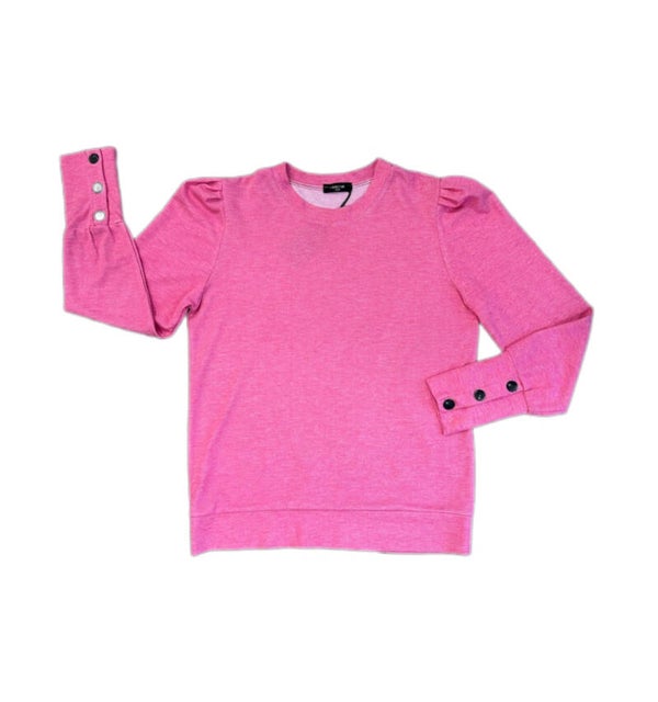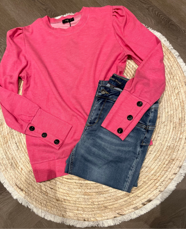 Fijne roze sweater met ronde hals en een klein pofmouwtje en op de mouwen zitten 3 knoopjes
