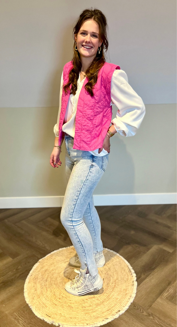 Dit model heeft een V-hals en de lange mouw is afgezet met een elastisch boordje. Dit model sluit middels een doorknoopsluiting. In maat S/M en L/XL .