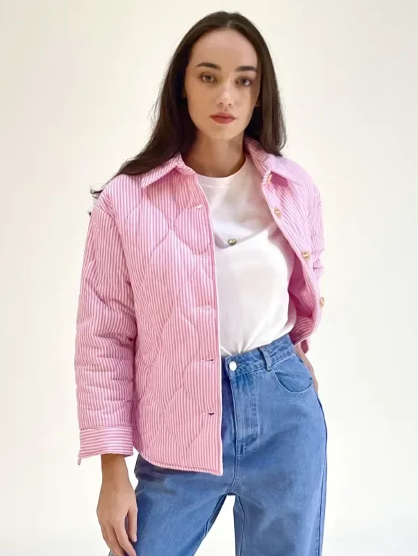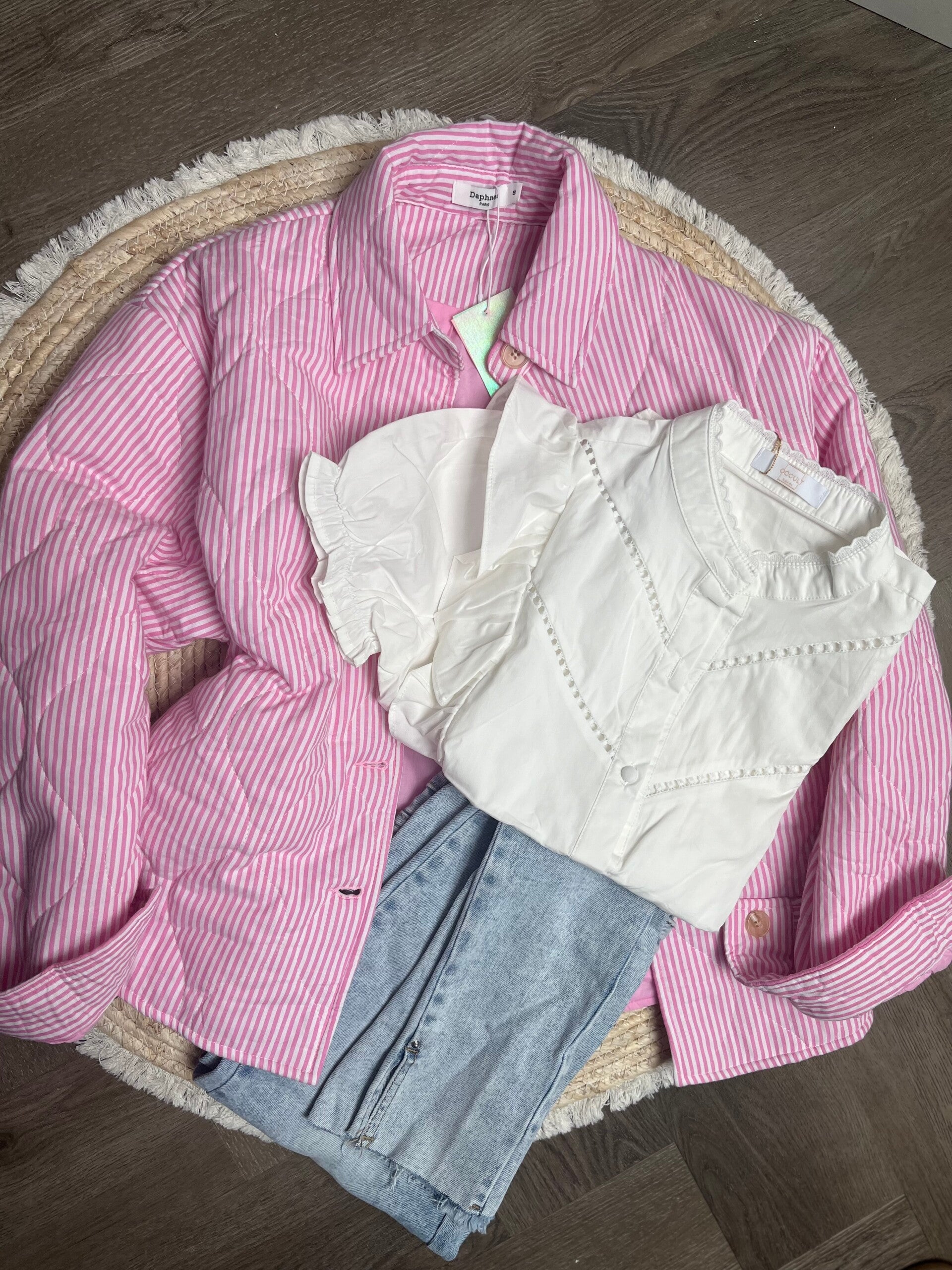 De Jas Fenna is een prachtig en stijlvol jasje in een zachte roze tint met subtiele witte streepjes voor een speels effect.