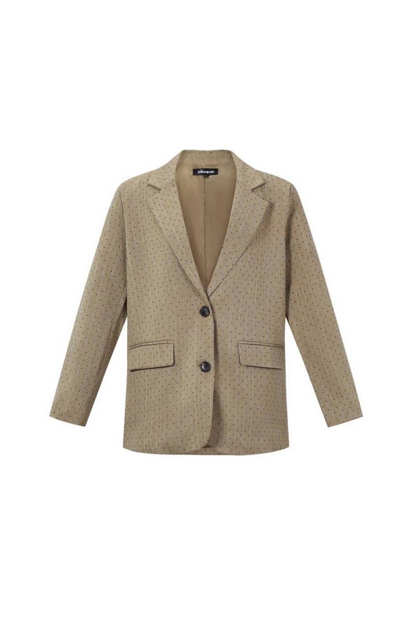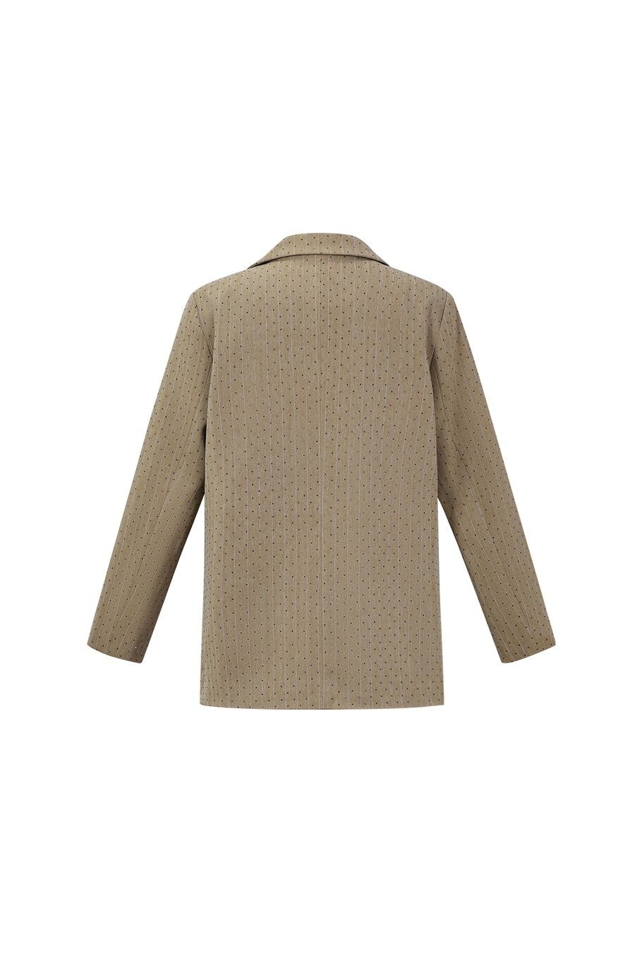 Geef je outfit een stijlvolle upgrade met deze prachtige bruine blazer met strass streepjes. Deze blazer geeft een vleugje glamour dankzij de subtiele glinstering van de strassdetails. Perfect voor zowel formele gelegenheden als een avondje uit. De bruine tint zorgt voor een warme en tijdloze uitstraling, terwijl de strass accenten een unieke en trendy touch toevoegen. Combineer deze blazer met een nette broek, of draag hem casual met een spijkerbroek en sneakers. Een veelzijdige must-have voor iedere garderobe!