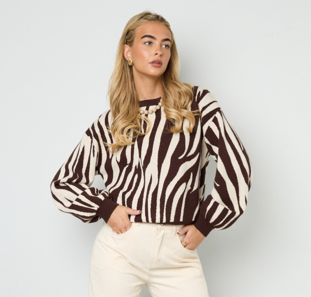 Deze bruine trui met strepen is dé trend van het seizoen! De combinatie van het warme bruine kleurenschema en het speelse zebra-design maakt dit kledingstuk zowel modieus als opvallend. Perfect te combineren met een pantalon of een casual jeans, afhankelijk van de gelegenheid. Daarnaast is deze trui niet alleen trendy, maar ook heerlijk comfortabel.